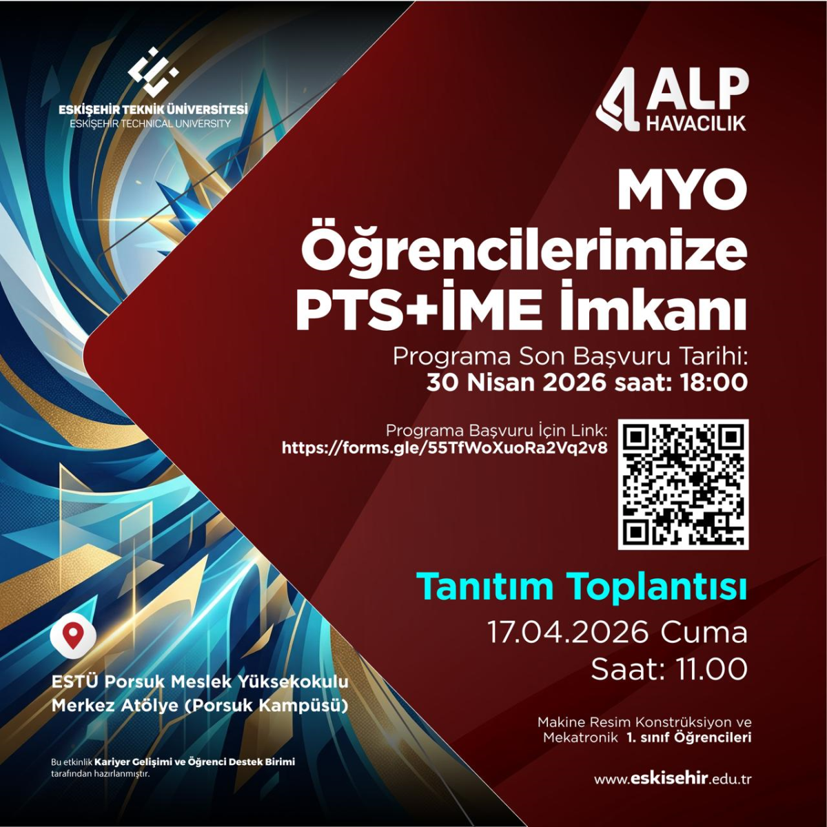 Eskişehir Teknik Üniversitesi (ESTÜ) Kariyer Gelişimi ve Öğrenci Destek Birimi koordinasyonunda, Alp Havacılık iş birliğiyle yürütülen Aday Teknisyen Programı (PTS) ve İşletmede Mesleki Eğitim (İME) fırsatları öğrencilerimizle buluşuyor. Porsuk Meslek Yüksekokulu öğrencilerine yönelik hazırlanan bu özel program için bir tanıtım toplantısı gerçekleştiriliyor.