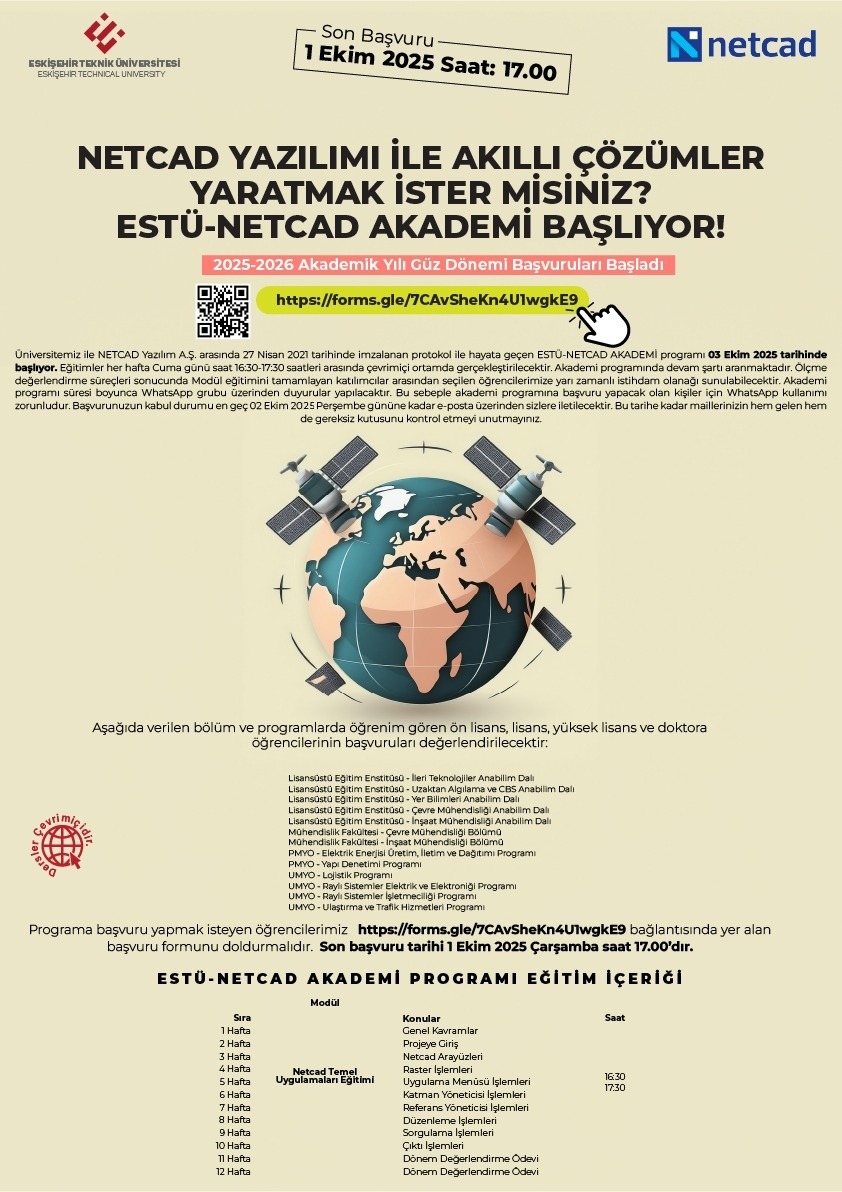 Üniversitemiz ile NETCAD Yazılım A.Ş. arasında 27 Nisan 2021 tarihinde imzalanan protokol ile hayata geçen ESTÜ-NETCAD AKADEMİ programı 03 Ekim 2025 tarihinde başlıyor. Eğitimler her hafta Cuma günü saat 16:30-17:30 saatleri arasında çevrimiçi ortamda gerçekleştirilecektir. Akademi programında devam şartı aranmaktadır. Ölçme değerlendirme süreçleri sonucunda Modül eğitimini tamamlayan katılımcılar arasından seçilen öğrencilerimize yarı zamanlı istihdam olanağı sunulabilecektir. Akademi programı süresi boyunca WhatsApp grubu üzerinden duyurular yapılacaktır. Bu sebeple akademi programına başvuru yapacak olan kişiler için WhatsApp kullanımı zorunludur. Başvurunuzun kabul durumu en geç 02 Ekim 2025 Perşembe gününe kadar e-posta üzerinden sizlere iletilecektir. Bu tarihe kadar maillerinizin hem gelen hem de gereksiz kutusunu kontrol etmeyi unutmayınız. Programa başvuru yapmak isteyen öğrencilerimiz https://forms.gle/7CAvSheKn4U1wgkE9 bağlantısında yer alan başvuru formunu doldurmalıdır. Son başvuru tarihi 01 Ekim 2025 Çarşamba günü saat 17:00’dır. Detay program için tıklayınız.