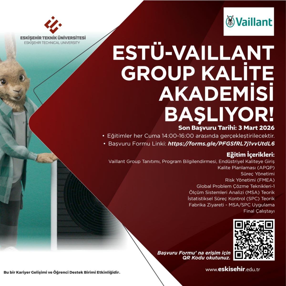 Öğrencilerimizi program boyunca Vaillant Group’un profesyonelleriyle bir araya getiren ESTÜ- VAILLANT GROUP KALİTE Akademi Programı 6 Mart 2026 Cuma günü saat 14:00’de başlayacaktır. Uluslararası kabul edilmiş kalite standartları ve öğrencilerimizi profesyonel yaşama hazırlamaya yönelik eğitimler ile devam edecek olan program, Final Çalıştayı ile son bulacaktır.