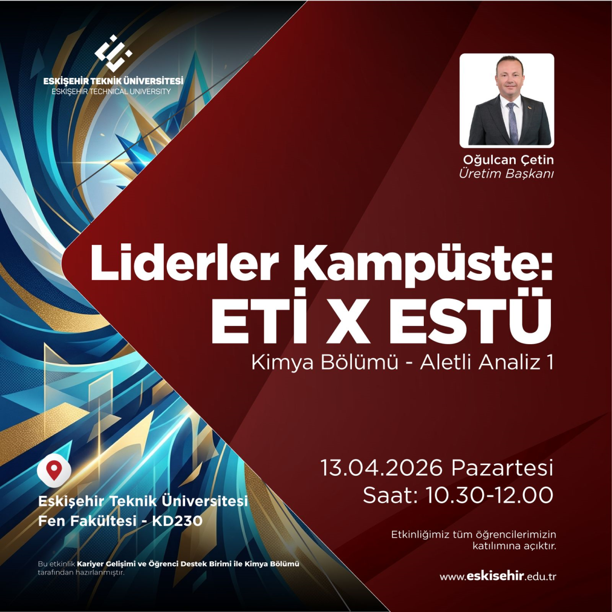 Eskişehir Teknik Üniversitesi (ESTÜ) Kariyer Gelişimi ve Öğrenci Destek Birimi ile Kimya Bölümü iş birliğinde düzenlenen "Liderler Kampüste: ETİ X ESTÜ" etkinliği, 13 Nisan 2026 Pazartesi günü gerçekleştiriliyor. Programın bu haftaki konuğu, ETİ Üretim Başkanı Sayın Oğulcan Çetin oluyor.